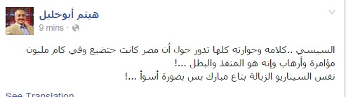 وأضاف أبو خليل فى تدوينة غبر صفحته على موقع التواصل الاجتماعي "فيس بوك":السيسي ..كلامه وحوارته كلها تدور حول أن مصر كانت حتضيع وفي كام مليون مؤامرة وأرهاب وإنه هو المنقذ والبطل".