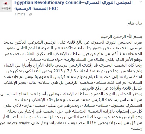 أعرب المجلس الثوري المصري عن بالغ قلقه على الرئيس الشرعي الدكتور محمد مرسي الذي تغيب عن حضور جلساته محاكمته غير الشرعية للمرة الثانية ،وهو المختطف منذ أكثر من عام من قبل سلطات اانقلاب العسكري الفاشي في مصر -حسب وصف البيان- وهو اﻷمر الذي يلقي بظلال من الشك والريبة حول سلامة سيادته.