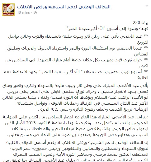 دعا التحالف الوطني لدعم الشرعية ورفض الانقلاب الشعب المصري "الثائر" إلى إعلاء قضية الشهداء والوطن في العيد ، والمشاركة في حراك ثوري قوي ومهيب في السادس من أكتوبر ضمن أسبوع ثوري تحضيري تحت عنوان " الله أكبر.. عيدنا النصر " يعلوه التكبير- شعيرة العيد وهتاف أكتوبر.