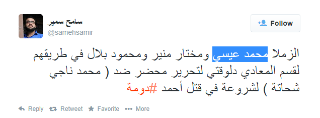 حيث قال في تدوينة له على موقع التواصل الاجتماعي "تويتر": "الزملاء محمد عيسى، ومختار منير، ومحمود بلال، في طريقهم لقسم المعادي دلوقتي لتحرير محضر ضد (محمد ناجي شحاتة) لشروعه في قتل أحمد دومة".