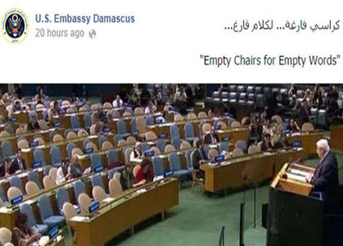 شهدت الصفحة الرسمية للسفارة الأمريكية في دمشق، عبر موقع التواصل الاجتماعي "فيس بوك"، جدالًا ساخنًا بين أنصار الرئيس السوري، بشار الأسد، وخصومه، إذ قامت الصفحة بنشر صورة لوزير الخارجية السوري، وليد المعلم، أثناء إلقائه كلمة بلاده بالجمعية العامة للأمم المتحدة، وتبدو فيها مقاعد الحضور خالية، وعلقت بالقول "مقاعد فارغة لكلام فارغ".