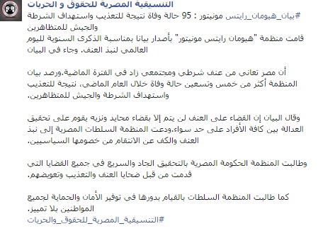 قالت منظمة هيومان رايتس مونيتور إن مصر تعاني من عنف شرطي ومجتمعي زاد في الفترة الماضية، مضيفة أنها رصدت المنظمة أكثر من خمس وتسعين حالة وفاة خلال العام الماضي، نتيجة للتعذيب واستهداف الشرطة والجيش للمتظاهرين.