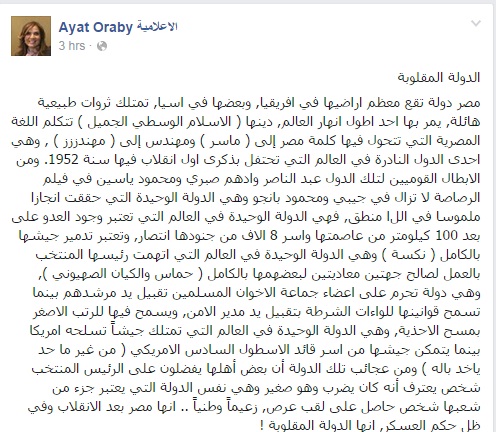 واختتمت العرابى قائلة: إنها مصر بعد الانقلاب وفي ظل حكم العسكر.. إنها الدولة المقلوبة.