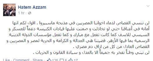وأضاف عزام فى تدوينة عبر صفحته على موقع التواصل الاجتماعي "فيس بوك": في ذكرى مذبحة ماسبيرو "لن ننسى القصاص لدماء إخواننا المصريين في مذبحة ماسبيرو، أقول لكم إنها أمانة قي أعناقنا حتى لو تخاذلت وصمتت عليها قيادات الكنيسة دعمًا للعسكر والسيسي، كما كانت تفعل مع مبارك، وكما تفعل مؤسسات الدولة الدينية الرسمية بما فيها الأزهر".