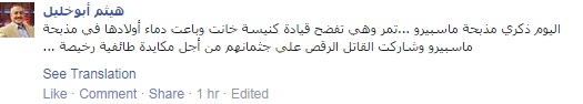 وأضاف أبو خليل فى تدوينه عبر صفحته على "فيس بوك"، "اليوم ذكري مذبحة ماسبيرو …تمر وهي تفضح قيادة كنيسة خانت وباعت دماء أولادها في مذبحة ماسبيرو وشاركت القاتل الرقص علي جثمانهم من أجل مكايدة طائفية رخيصة ".