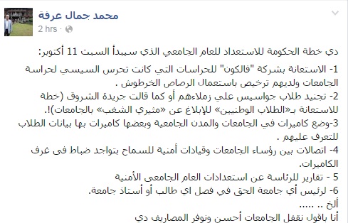 وأضاف عرفة فى تدوينة عبر صفحته على "فيس بوك" أن أولى عناصر الخطة تتمثل فى الاستعانة بشركة "فالكون" للحراسات التي كانت تحرس حملة المشير عبد الفتاح السيسى، قائد الانقلاب العسكري لحراسة الجامعات، ولديهم ترخيص باستعمال الرصاص الخرطوش.