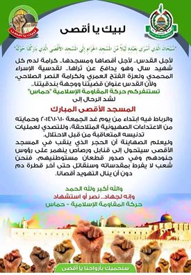 أعلنت حركة المقاومة الإسلامية حماس، عن شدِّ الرحال إلى المسجد الأقصى المبارك والرباط فيه، ابتداءً من يوم غدٍ الجمعة 10 – 10 – 2014، وذلك للتصدي لعمليات التدنيس المستمرة، التي يقوم بها جنود الكيان الصهيوني.