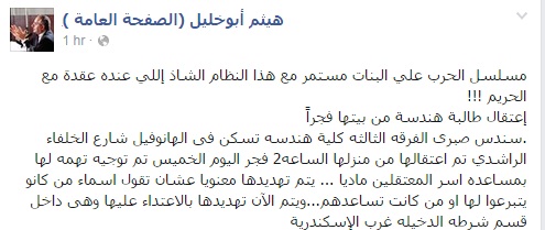 وتابع مدير مركز ضحايا لحقوق الإنسان: "إن مسلسل الحرب على البنات مستمر، مع هذا النظام الشاذ اللي عنده عقدة مع الحريم!".