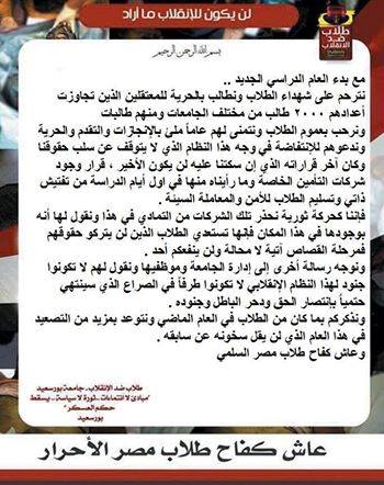 و قال البيان "إنه مع بدء العام الدراسي الجديد نترحم علي شهداء الطلاب و نطالب الحرية للمعتقلين الذين تجاوزت أعدادهم 2000 طالب في مختلف الجامعات ومنهم طالبات ونرحب بعموم الطلاب و نتمنى لهم عاماً ملئ بالإنجازات و التقدم و الحرية"