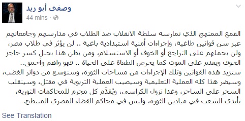 وأضاف أبو زيد فى تدوينة عبر صفحته على موقع التواصل الاجتماعي "فيس بوك" "أن هذا القمع لا يؤثر في طلاب مصر، ولن يحملهم على التراجع أو الخوف أو الاستسلام، ومن يظن هذا بجيل كسر حاجز الخوف ويقدم على الموت كما يحرص الطغاة على الحياة .. فهو واهم وأحمق."