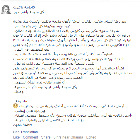 كان المحامي محمد أحمد محمد إبراهيم قد تقدم ببلاغ حمل رقم 20522 لسنة 2014 عرائض النائب العام ذكر فيه أن فاطمة ناعوت قامت بكتابة "كل مذبحة وأنتم بخير" عبر حسابها على موقعي التواصل الاجتماعي "فيس بوك" و"تويتر"، وكتبت في مقال نشرته جريدة "المصري اليوم" قالت فيه: بعد برهة تساق ملايين الكائنات البرية لأهول مذبحة يرتكبها الإنسان منذ عشرة قرون ونصف ويكررها وهو يبتسم، مذبحة سنوية تكرر بسبب كابوس أحد الصالحين بشأن ولده الصالح، وبرغم أن الكابوس قد مر بسلام على الرجل الصالح وولده، إلا أن كائنات لا حول لها ولا قوة تدفع كل عام أرواحها وتنحر أعناقها وتهرق دماؤها دون جريرة ولا ذنب ثمنا لهذا الكابوس القدسي، رغم أن اسمها وفصيلها فى شجرة الكائنات لم يحدد على نحو التخصيص فى النص، فعبارة ذبح عظيم لا تعني بالضرورة خروفا ولا نعجة ولا جديا ولا عنزة، لكنها شهوة النحر والسلخ والشى ورائحة الضأن بشحمه ودهنه، جعلت الإنسان يلبس الشهية ثوب القداسة وقدسية النص الذى لم يقل.