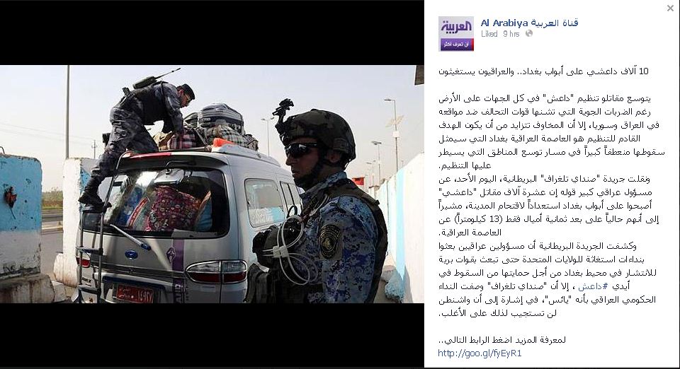 وقالت العربية في تقريرها اليوم: "توسع مقاتلو تنظيم "داعش" في كل الجهات على الأرض على الرغم من الضربات الجوية التي تشنها قوات التحالف ضد مواقعه في العراق وسوريا، إلا أن المخاوف تتزايد من أن يكون الهدف القادم للتنظيم هو العاصمة العراقية بغداد التي سيمثل سقوطها منعطفًا كبيرًا في مسار توسع المناطق التي يسيطر عليها التنظيم."