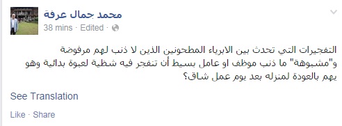 وقال عرفه في تدوينة عبر صفحته على موقع التواصل الاجتماعي "فيس بوك": "التفجيرات التي تحدث بين الأبرياء المطحونين الذين لا ذنب لهم مرفوضة ومشبوهة".