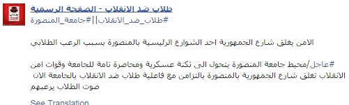 وقالت صفحة "طلاب ضد الانقلاب" عبر موقع التواصل الاجتماعي "فيس بوك": "إن محيط جامعة المنصورة تحول إلى ثكنة عسكرية، ومحاصرة تامة للجامعة، فيما أغلقت قوات أمن الانقلاب شارع الجمهورية بالمنصورة، بالتزامن مع فعالية طلاب ضد الانقلاب بالجامعة الآن".