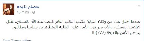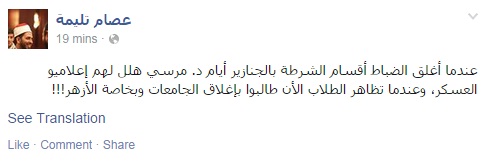 وأضاف تليمة فى تدوينة عبر صفحته على موقع التواصل الاجتماعي" فيس بوك""عندما احتل عدد من وكلاء النيابة مكتب النائب العام طلعت عبد الله بالسلاح، هلل إعلاميو العسكر، والآن يحرضون الأمن على الطلبة المتظاهرين سلميا ويطالبون بتدخل الأمن والفرقة (777)!!!.