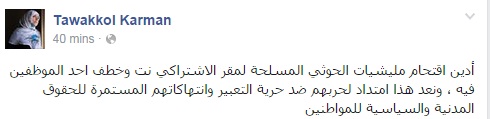 أدانت توكل كرمان، الناشطة اليمنية، والحائزة على جائزة نوبل للسلام، اقتحام الحوثيين لمقر الاشتراكي نت، وقيامها بخطف أحد الموظفين فيه.