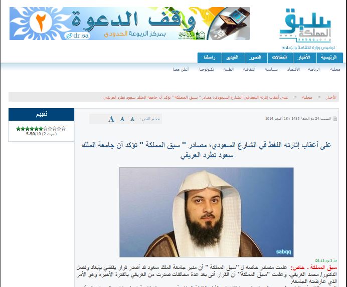 وقالت الصحيفة في الخبر: "أصدر مدير جامعة الملك سعود قرارًا يقضي بإبعاد وفصل الدكتور محمد العريفي، وعلمت "سبق " أن القرار أتى بعد عدة مخالفات صدرت من العريفي بالفترة الأخيرة، وهو الأمر الذي عارضته الجامعه".