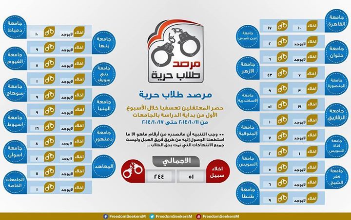 وقال المرصد فى بيان له عبر صفحته الرسمية إن إجمالي عدد الطلاب المعتقلين منذ فجر يوم السبت 11-10-2014 وحتى يوم الجمعة 17-10-2014 إلى (244 ) معتقل , تم إخلاء سبيل ( 51 ) طالبا منهم .