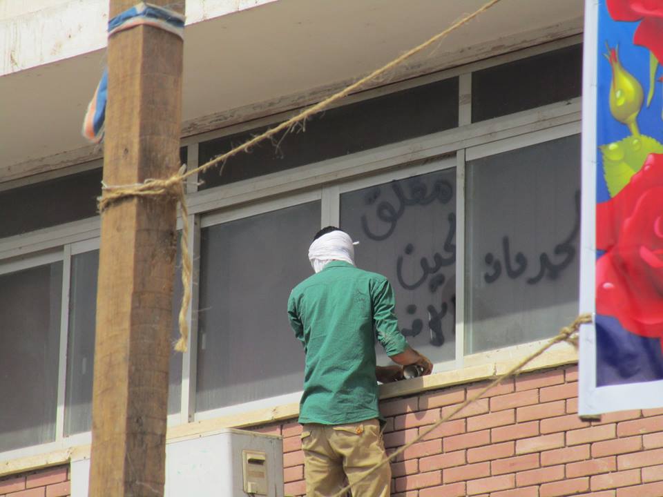 وتحركت المسييرة لتمر بكلية الصيدلة، وقاموا بإعلان اعتصام جزئى وتصعيد، وإغلاق بوابات الكلية بالسلاسل ومنع الدخول والخروج، لعدة دقائق، تنديدًا باعتقال الطالب" مصطفى أحمد"، وللمطالبة بالقصاص لدماء الشهداء.