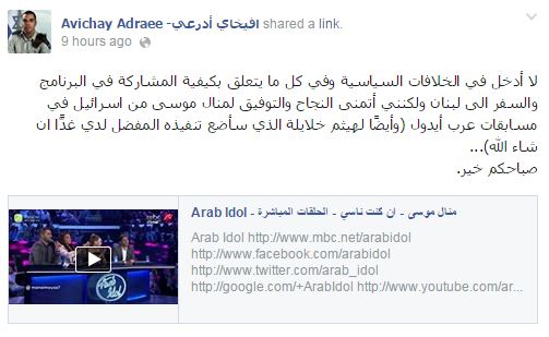 أعلن المتحدث الرسمي بإسم الجيش الصهيوني أفخاي أدرعي تشجيعة لأحدى المتسابقات في برنامج المسابقات الغنائية الشهير أراب ايدول مؤكدا انه يتمنى لها التوفيق.