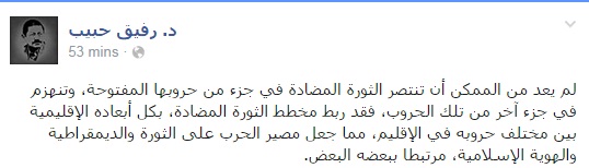وأضاف حبيب فى تدوينه عبر صفحته على موقع التواصل الاجتماعي" فيس بوك"لم يعد من الممكن أن تنتصر الثورة المضادة في جزء من حروبها المفتوحة، وتنهزم في جزء آخر من تلك الحروب، فقد ربط مخطط الثورة المضادة، بكل أبعاده الإقليمية بين مختلف حروبه في الإقليم، مما جعل مصير الحرب على الثورة والديمقراطية والهوية الإسلامية، مرتبطا يبعضه البعض.