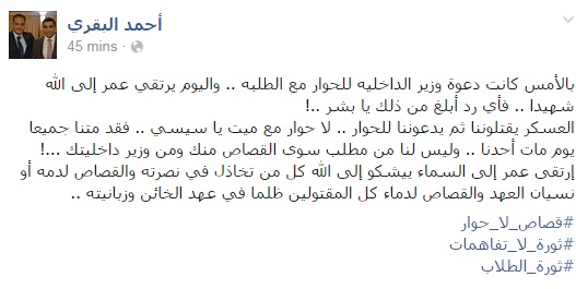 وأضاف البقري في تدوينة عبر صفحته الرسمية على موقع التواصل الاجتماعى "فيس بوك": "العسكر يقتلوننا ثم يدعوننا للحوار .. لا حوار مع ميت يا سيسي .. فقد متنا جميعا يوم مات أحدنا .. وليس لنا من مطلب سوى القصاص منك ومن وزير داخليتك …!".