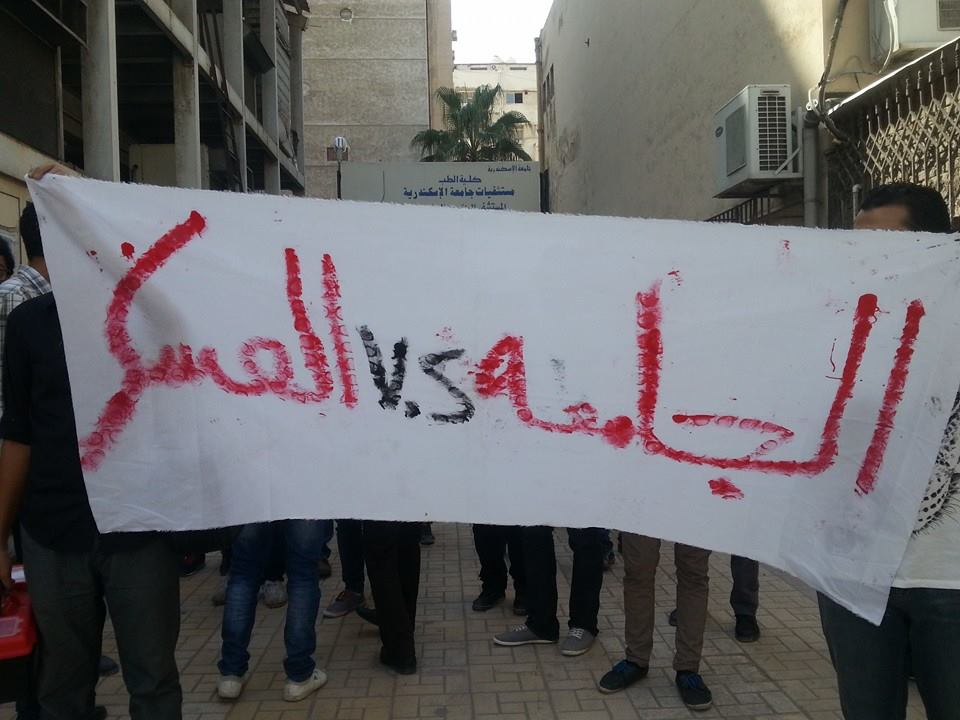 نظمت حركة "طلاب ضد الانقلاب" بالمجمع الطبى بجامعة الإسكندرية، اليوم تظاهرة طافت أرجاء المجمع، بدأت من ساحة كلية الصيدلة مرورًا بكلية الطب البشري، وكلية طب الأسنان؛ للتنديد بمقتل الطالب "عمر الشريف"، متأثرًا بجراحه فى أحداث اقتحام أمن الانقلاب لكلية الهندسة يوم الثلاثاء الماضي.