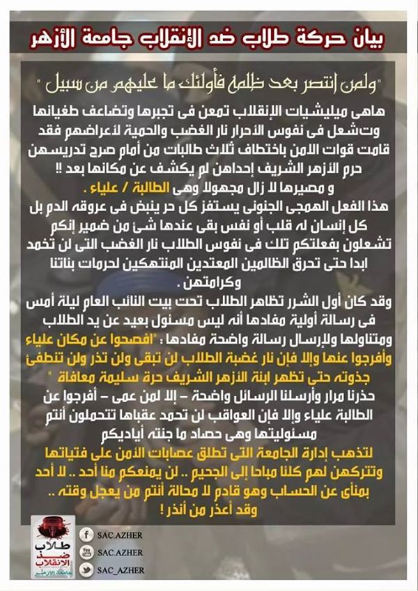 وقالت الحركة في بيان لها اليوم عبر صفحتها الرسمية على موقع التواصل الاجتماعي "فيس بوك": "ها هي ميليشيات الانقلاب تمعن في تجبرها، وتضاعف طغيانها وتشعل في نفوس الأحرار نار الغضب والحمية لأعراضهم، فقد قامت قوات الأمن باختطاف ثلاث طالبات من أمام صرح تدريسهن حرم الأزهر الشريف، إحداهن لم يكشف عن مكانها بعد مصيرها لا زال مجهولا وهى الطالبة علياء".