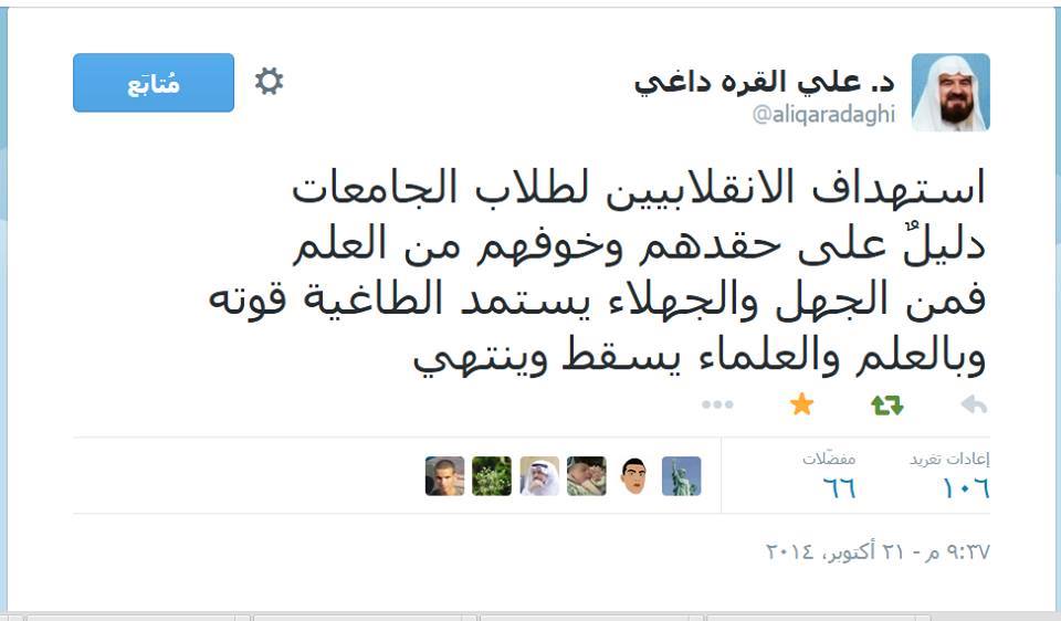 قال الدكتور على القرة داغى ،الأمين العام للاتحاد العالمي لعلماء المسلمين إن استهداف سلطات الانقلاب لطلاب الجامعات دليل على حقدهم وخوفهم من العلم.
