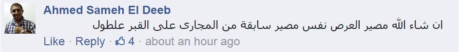 أما Ahmed Sameh El Deebفقال : إن شاء الله مصير العر* نفس مصير سابقة من المجارى على القبر علطول.