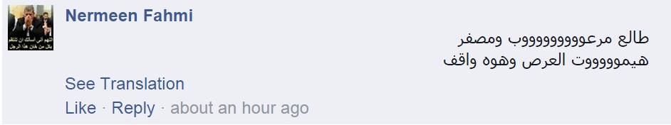 أما Nermeen Fahmiفاعتبرت أن تعبيرات وجه السيسى تؤكد أنه مرعوب ويعانى من حالة عصبية قائلة : طالع مرعوووووووووب ومصفر ، هيموووووت العر* وهوه واقف".