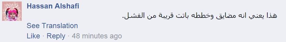 واعتبر Hassan Alshafiأن ظهور السيسى بمثل هذه الهيئة أنه فى حالة عصبية سيئة نتيجة فشل مخططاته الانقلابية وقال: هذا يعني انه مضايق وخططه باتت قريبة من الفشل.