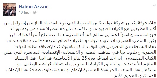 وأضاف عزام في تدوينة عبر صفحته على موقع التواصل الاجتماعي "فيس بوك": " لن يقبل الشعب المصري أن تنهب ثرواته و مقدراته، لصالح شرذمة فاسدة تتقوت علي دماء البسطاء من المصريين، في الوقت الذي يتآمرون فيه لإضعاف مكانة الدولة المصرية، و يلقون بها في غياهب التبعية والاعتمادية الاقتصادية المباشرة التي على الكيان الصهيوني".