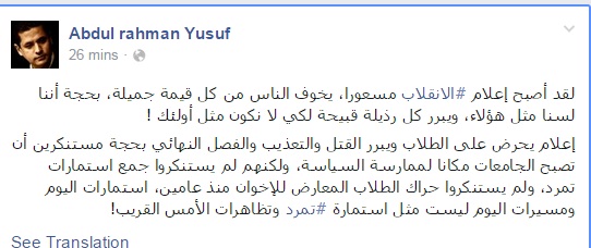 وأضاف يوسف: "إعلام يحرض على الطلاب، ويبرر القتل والتعذيب والفصل النهائي بحجة مستنكرين أن تصبح الجامعات مكانا لممارسة السياسة، ولكنهم لم يستنكروا جمع استمارات تمرد، ولم يستنكروا حراك الطلاب المعارض للإخوان منذ عامين، استمارات اليوم ومسيرات اليوم ليست مثل استمارة ‫‏تمرد وتظاهرات الأمس القريب!".
