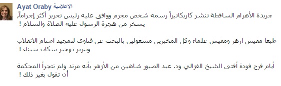 وقالت العرابى فى تدوينة عبر صفحتها على موقع التواصل الاجتماعي "فيس بوك": "جريدة الأهرام الساقطة تنشر كاريكاتيراً رسمه شخص مجرم ووافق عليه رئيس تحرير أكثر إجراماً, يسخر من هجرة الرسول عليه الصلاة والسلام !".