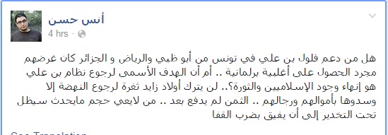 وتساءل حسن: هل من دعم فلول بن علي في تونس من أبو ظبي والرياض و الجزائر كان غرضهم مجرد الحصول على أغلبية برلمانية، أم أن الهدف الأسمى لرجوع نظام بن علي، هو إنهاء وجود الإسلاميين والثورة؟".
