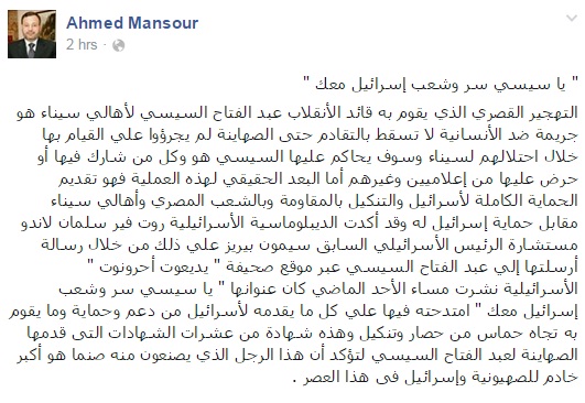 وتابع منصور: "وقد أكدت الدبلوماسية الإسرائيلية، روت فير سلمان لاندو، مستشارة الرئيس الإسرائيلي السابق، سيمون بيريز علي ذلك من خلال رسالة أرسلتها إلى عبدالفتاح السيسي، عبر موقع صحيفة "يديعوت أحرونوت" الإسرائيلية، نشرت مساء الأحد الماضي، كان عنوانها "يا سيسي سر وشعب إسرائيل معك"، امتدحته فيها على كل ما يقدمه لإسرائيل من دعم وحماية، وما يقوم به تجاه حماس من حصار وتنكيل".