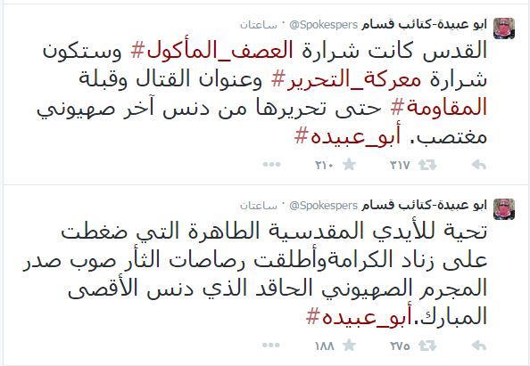 وأردف الناطق باسم كتائب عز الدين القسام، في تغريدة أخرى: "القدس كانت شرارة العصف المأكول، وستكون شرارة معركة التحرير، وعنوان القتال، وقبلة المقاومة؛ حتى تحريرها من دنس آخر صهيوني مغتصب".