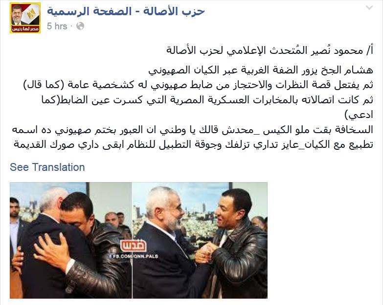 وقال نصير عبر الصفحة الرسمية للحزب على موقع التواصل الاجتماعي "فيس بوك": "هشام الجخ يزور الضفة الغربية عبر الكيان الصهيوني، ثم يفتعل قصة النظرات والاحتجاز من ضابط صهيوني له كشخصية عامة (كما قال)، ثم كانت اتصالاته بالمخابرات العسكرية المصرية التي كسرت عين الضابط (كما ادعى)".