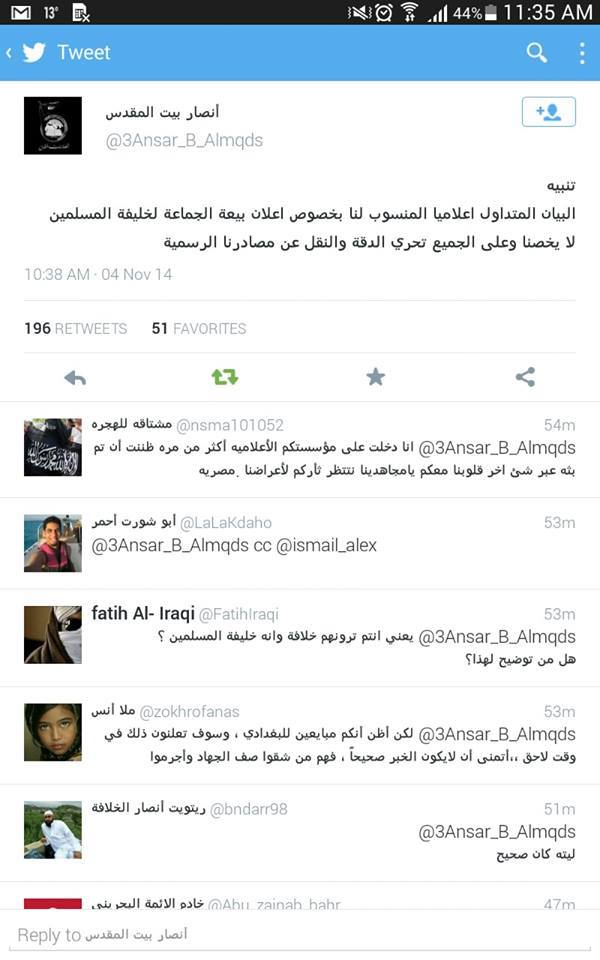 نفت جماعة أنصار بيت المقدس ما ورد في عدد من المواقع الإخبارية، حول مبايعتها لأبو بكر البغدادي، أمير تنظيم الدولة الإسلامية، والملقب بخليفة المسلمين.
