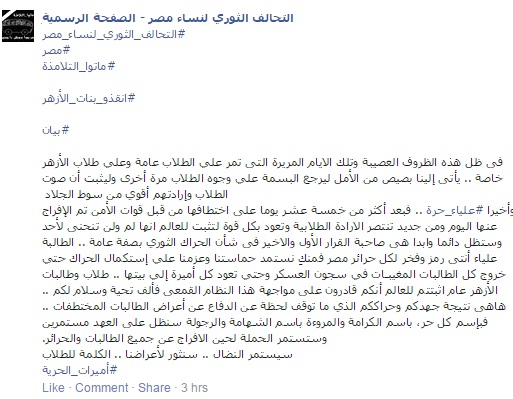 وتابع: "طلاب وطالبات الأزهر أثبتتم للعالم أنكم قادرون على مواجهة هذا النظام القمعى فألف تحية وسلام لكم .. ها هي نتيجة جهدكم وحراككم الذي ما توقف لحظة عن الدفاع عن أعراض الطالبات المختطفات".