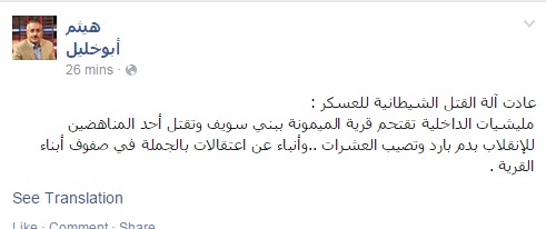 وتابع :"مليشيات الداخلية تقتحم قرية الميمونة ببني سويف، وتقتل أحد المناهضين للانقلاب بدم بارد، وتصيب العشرات، وأنباء عن اعتقالات بالجملة في صفوف أبناء القرية".