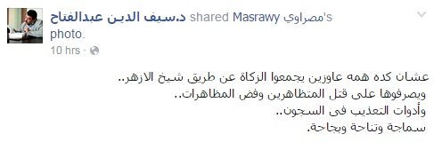 وعلق عبد الفتاح فى تدوينة عبر صفحته على "فيس بوك": "عشان كده همه عاوزين يجمعوا الزكاة عن طريق شيخ الأزهر.. ويصرفوها على قتل المتظاهرين وفض المظاهرات.. وأدوات التعذيب فى السجون".