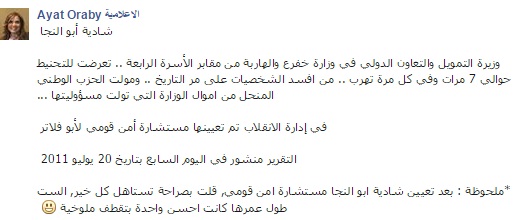 وقالت العرابي في تدوينة عبر صفحتها على موقع التواصل الاجتماعي "فيس بوك": "وزيرة التمويل والتعاون الدولي في وزارة خفرع، والهاربة من مقابر الأسرة الرابعة.. تعرضت للتحنيط حوالي 7 مرات، وفي كل مرة تهرب"، مضيفة أنها "من أفسد الشخصيات على مر التاريخ.. ومولت الحزب الوطني المنحل من أموال الوزارة التي تولت مسئوليتها، في إدارة الانقلاب تم تعيينها مستشارة أمن قومي لأبو فلاتر".