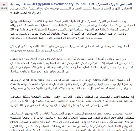 رحب المجلس الثوري المصري بكل الفعاليات التي تهدف لمقاومة الانقلاب وإسقاطه، مضيفا أنه يتابع "عن كثب الدعوات التي تصدر بشكل مستمر لفعاليات تحت شعارات مختلفة"، مشيرا إلى دعوة الجبهة السلفية للإسلاميين خصيصا للمشاركة في فاعلية يوم 28 نوفمبر، مؤكدا أن "هذه الدعوة ومثيلاتها، مع ثقتنا في صدق نواياها، قد تفتح الطريق لانقسامات تضر بمسار توحيد الثورة والاصطفاف الوطني الذي يعمل الجميع على تحقيقه".