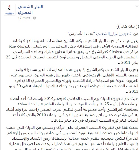 وأضاف البيان أن "تلفزيون الدولة قام يوم السبت الماضي 8 نوفمبر2014 بإستضافة أحد أعضاء برلمان ما قبل ثورة 25 يناير وأحد المرشحين للبرلمان القادم عن أحد المقاعد بمحافظة كفرالشيخ وأحد مجموعة أمين تنظيم الحزب المنحل (احمد عز) وقد أشاد به في مؤتمر صحفي رافق عملية التزوير الفج في برلمان 2010 والذي كان أحد أسباب قيام ثورة الشعب المصري في 25 يناير 2011".