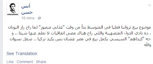 وقال حسن في تدوينة عبر صفحته على موقع التواصل الاجتماعي "فيس بوك": "موضوع بيع ثرواتنا فعليًا في المتوسط بدأ من وقت "عدلي منصور" لما راح زار اليونان".