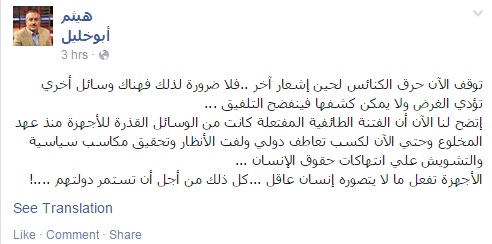 وقال أبو خليل في تدوينة عبر صفحته على موقع التواصل الاجتماعي "فيس بوك": "اتضح لنا الآن أن الفتنة الطائفية المفتعلة كانت من الوسائل القذرة للأجهزة منذ عهد المخلوع وحتى الآن، لكسب تعاطف دولي، ولفت الأنظار، وتحقيق مكاسب سياسية، والتشويش علي انتهاكات حقوق الإنسان".