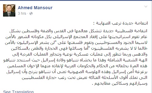 وأضاف منصور في تدوينة عبر صفحته على موقع التواصل الاجتماعي" فيس بوك": "أما وسائلها فهي الحجارة، والطعن بالسكاكين، والدهس، وربما تتطور إلى عمليات عسكرية نوعية، وتتجاوز العمليات الفردية إلى الهبة الشعبية الشاملة، وهذا ما يخشاه نتنياهو وقادة إسرائيل؛ حيث استنجد نتنياهو هذه المرة بحلفائه من الحكام والحكومات العربية لإنقاذه، متهما الإخوان المسلمين بزعزعة أمن إسرائيل".