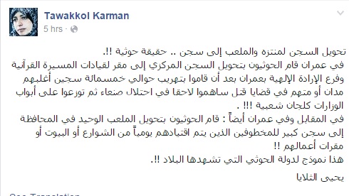 أكدت توكل كرمان، الناشطة اليمنية، أن قوات الحوثيين حولوا السجن المركزي، إلى مقر لقيادات المسيرة القرآنية، وحولوا الملعب الوحيد في المدينة إلى سجن كبير للمخطوفين.